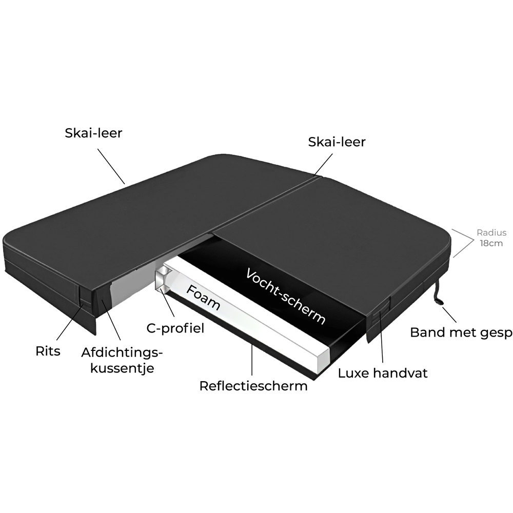 Geen spa van bubbelkoning? Meet de radius van de hoeken van uw spa zoals hieronder aangegeven. Onze covers hebben standaard een radius van 18cm.